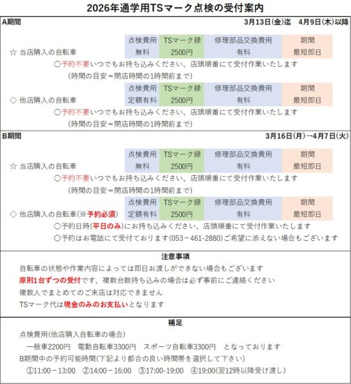 ホーム > "安心・安全"各種登録 > ☆2026年通学用自転車「TSマーク」点検のご案内☆